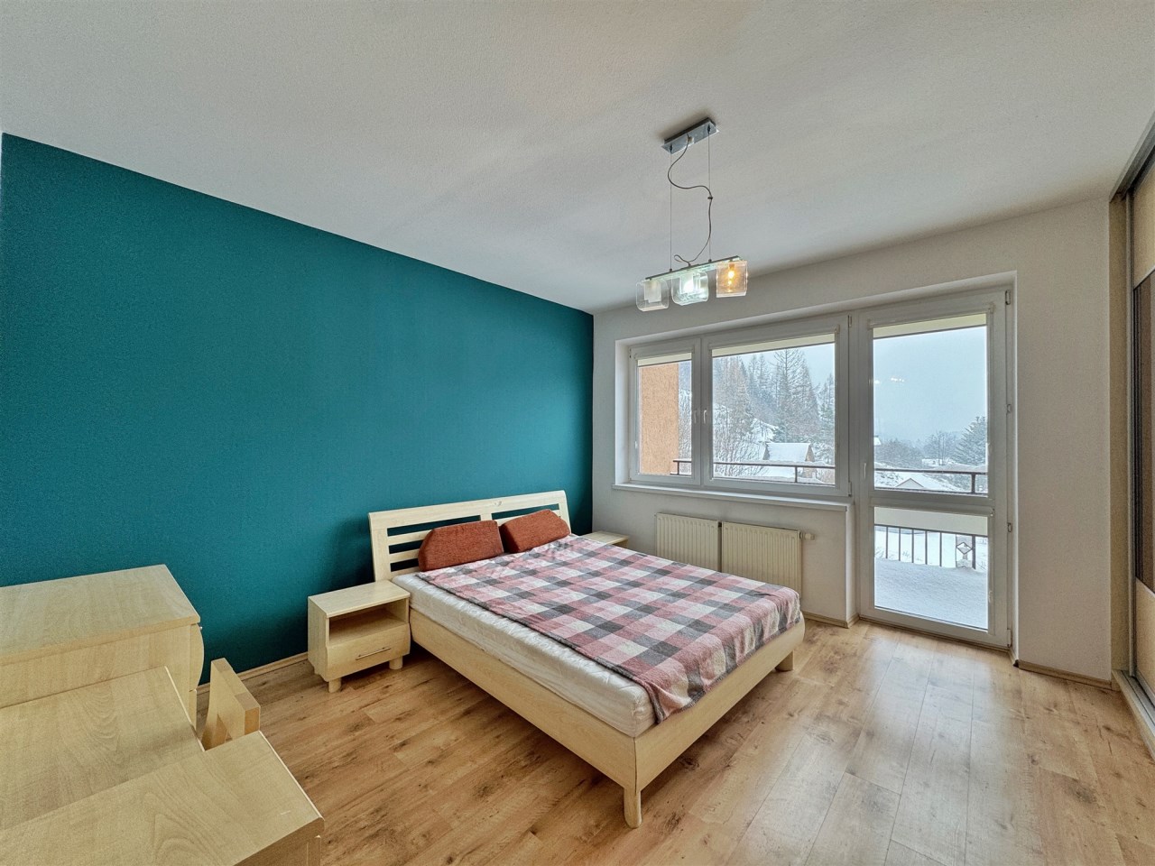 Salon sporej wielkości z wyjściem na balkon na podłodze deska Barlinecka natomiast w pokojach wysokiej klasy panele.