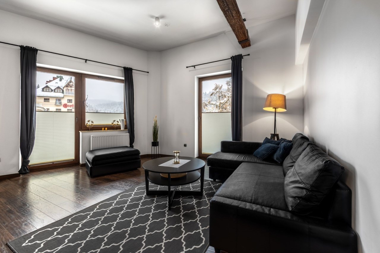 Prezentujemy wygodny i funkcjonalny apartament zlokalizowany na pierwszym piętrze nowoczesnego budynku w ścisłym centrum Krynicy Zdroju.
