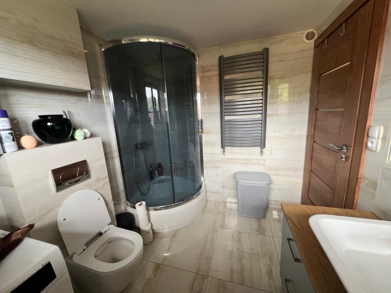 Parter: kuchnia, salon z kominkiem i z wyjściem na taras od strony południowej, przedpokój, łazienka z prysznicem i WC, sauna, kotłownia, spiżarnia.