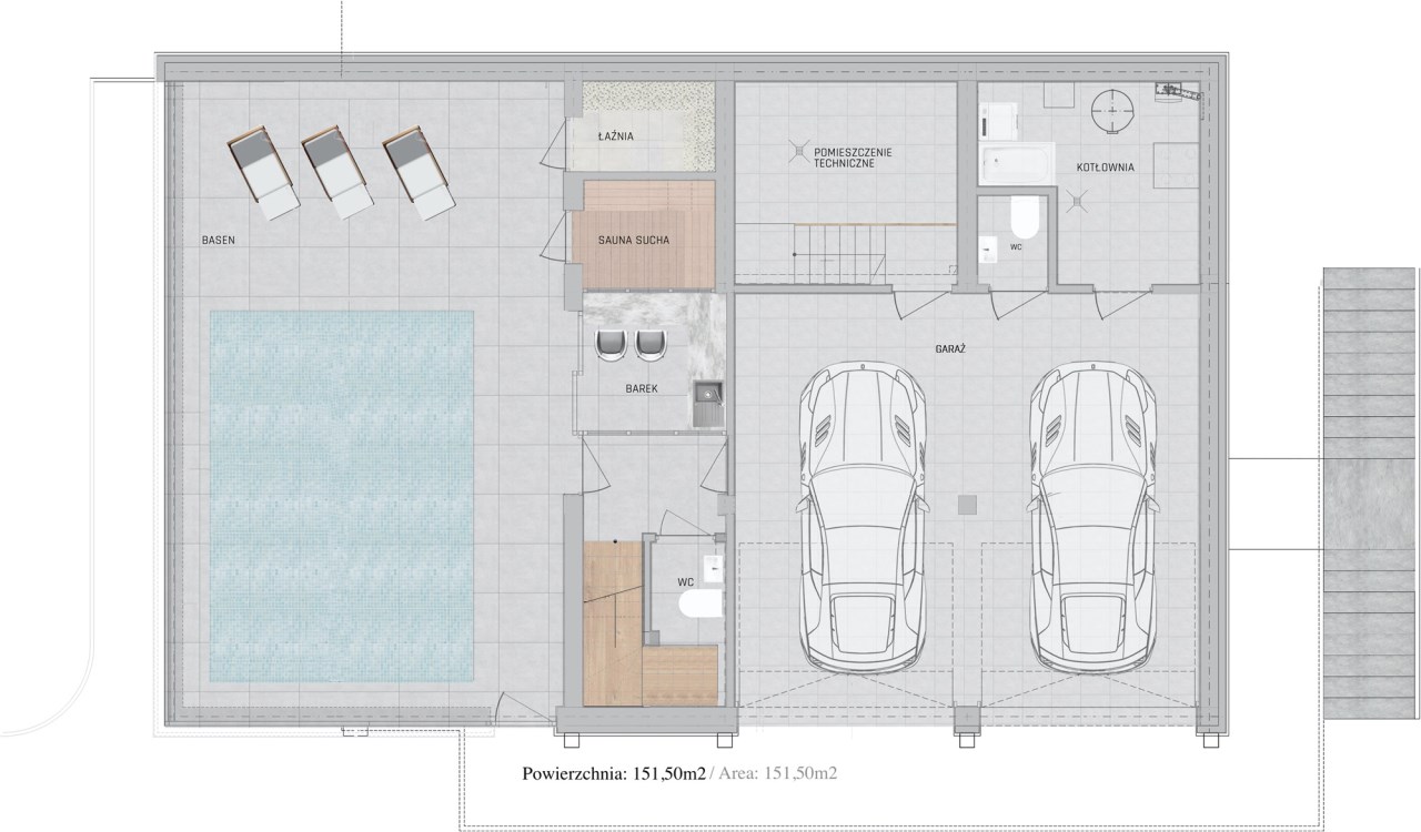 Dom posiada kilka zadaszonych werand i tarasów, urocze miejsce na zewnątrz do grillowania i biesiadowania, duże garaże, a na poziomie -1 miejsce na strefę SPA, gdzie możesz mieć swój własny wewnętrzny przeszklony basen z plażą, saunarium, strefą fitness, z barkiem. Tutaj każdy znajdzie coś dla siebie.
