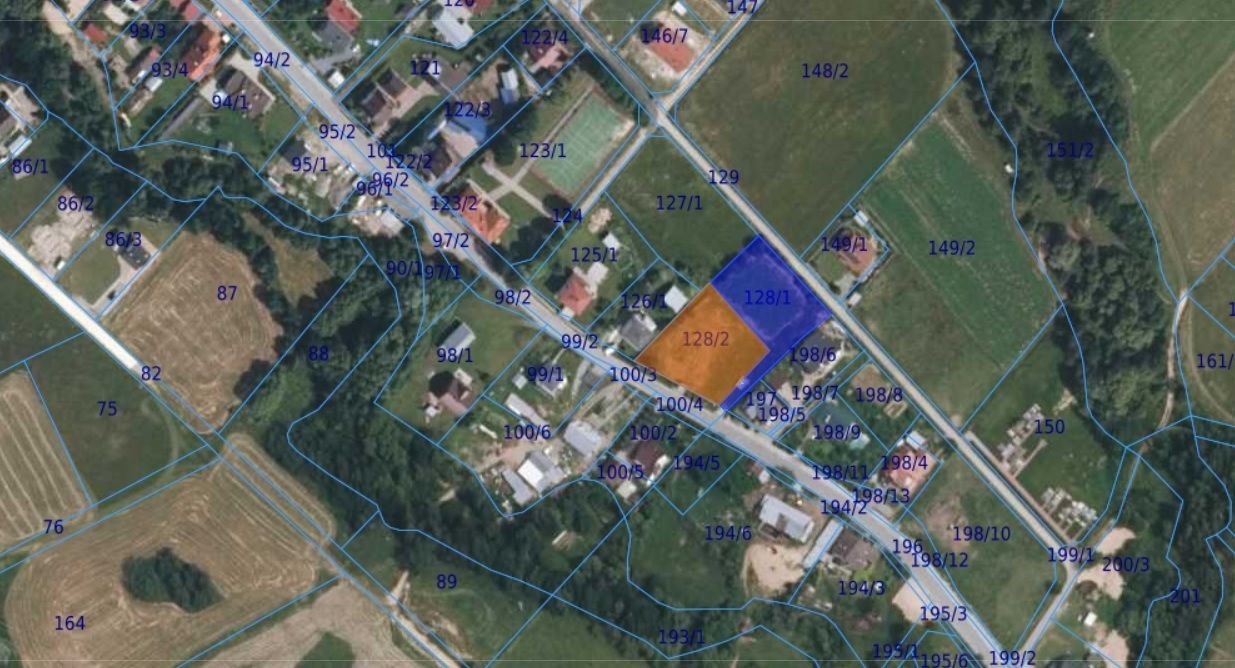 128/1 powierzchnia działki 1436 m/kw (oznaczona kolorem niebieskim)