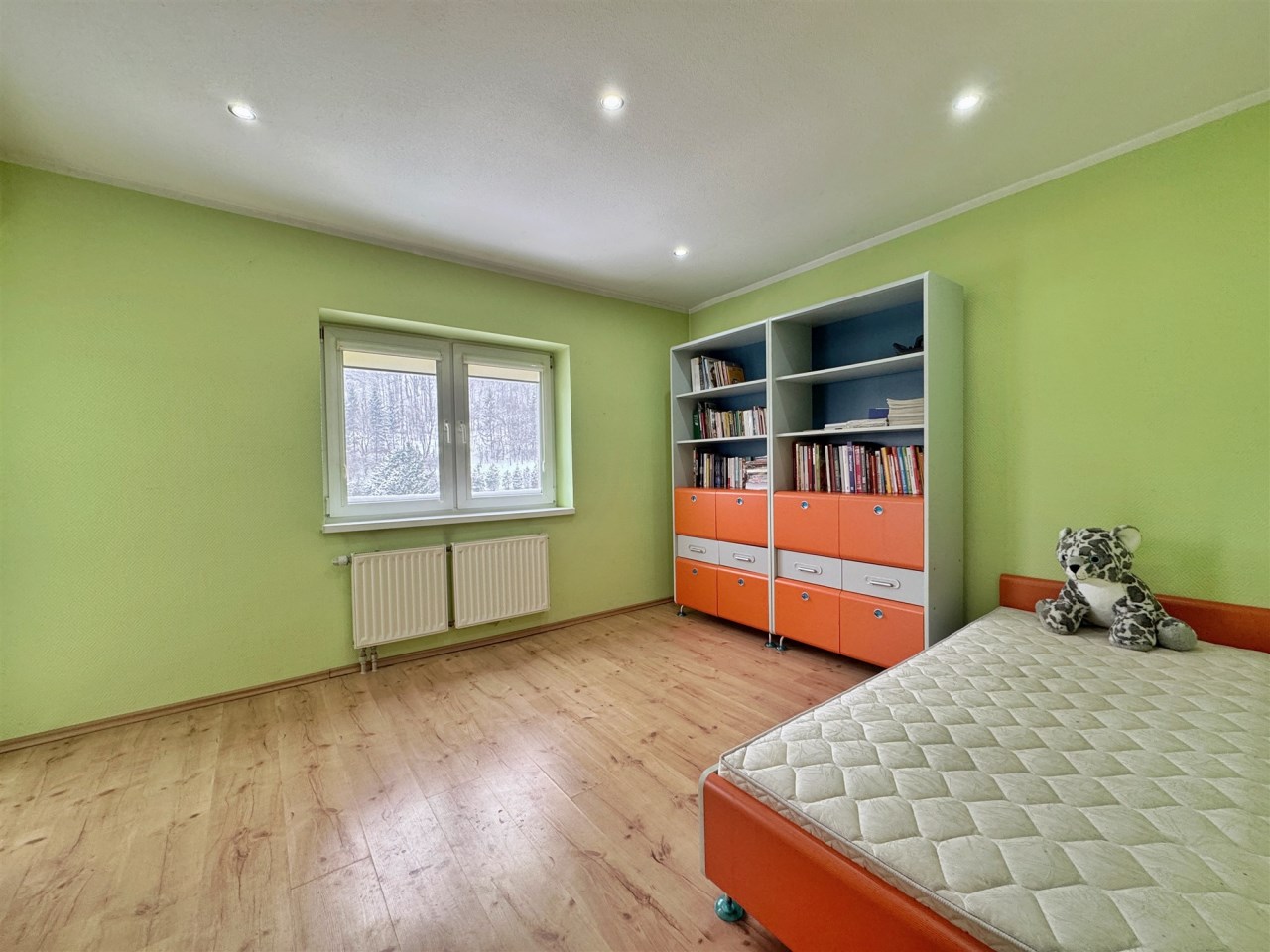 Pokój dziecięcy wyposażony w łóżko i szafę.