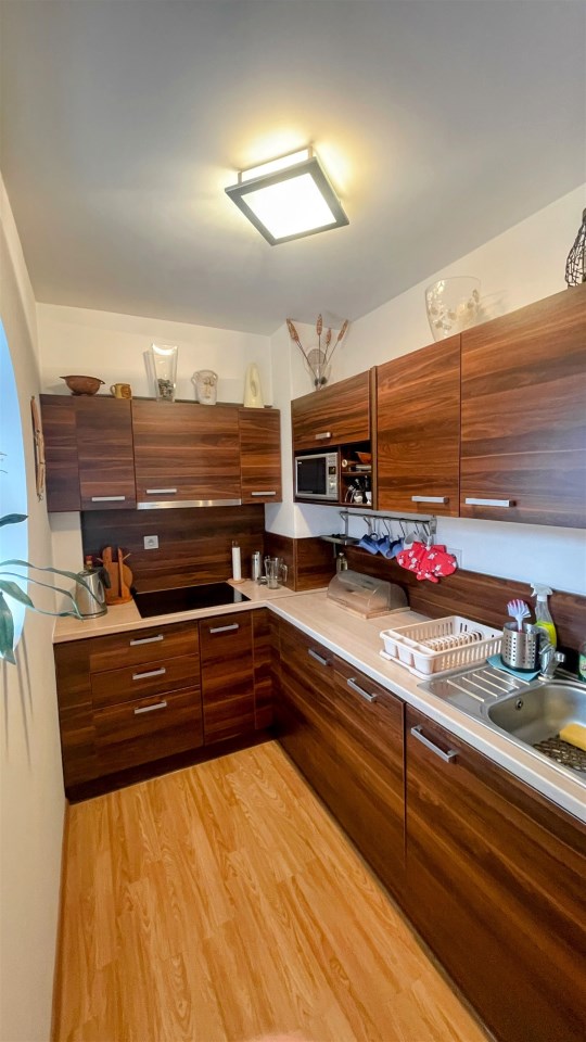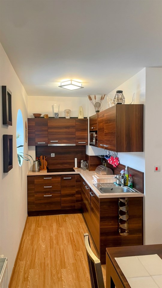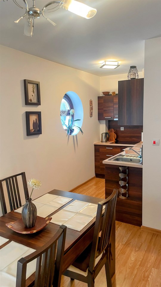 Apartament jest w pełni wyposażony i przygotowany dla Gości lub nowych Właścicieli, którzy chcą spędzić w nim czas w komfortowych warunkach. Kuchnia jest wyposażona w niezbędne urządzenia i sprzęty, co umożliwia samodzielne przygotowywanie posiłków. W łazience znajduje się prysznic oraz niezbędne akcesoria toaletowe. Wymieniony został piec na nowy.